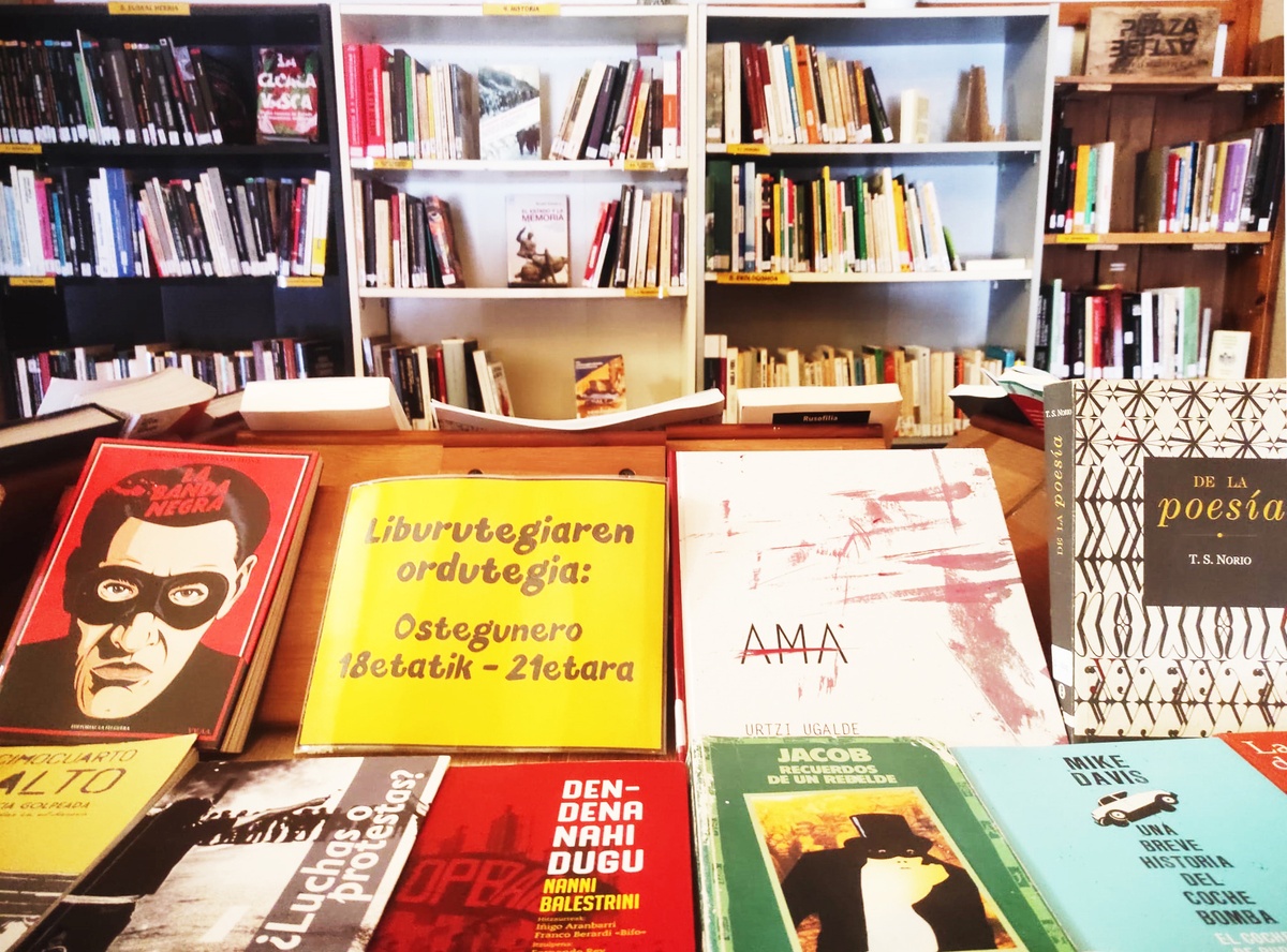 Liburutegiak 2000 ale baino gehiagoko liburu aukeratuak dauzka, gure inguruan ematen diren borroka sozial desberdinen ildoak elikatzeko. Liburu hauen ibilbidea 2009.urtean hasi zen, Larrabasterran, Plaza Beltza Kultur Gunearen sorrerarekin. Liburutegia asanbladan antolatzen da eta era desberdinetan autogestionatzen da, inolako diru laguntza instituzionalik gabe.