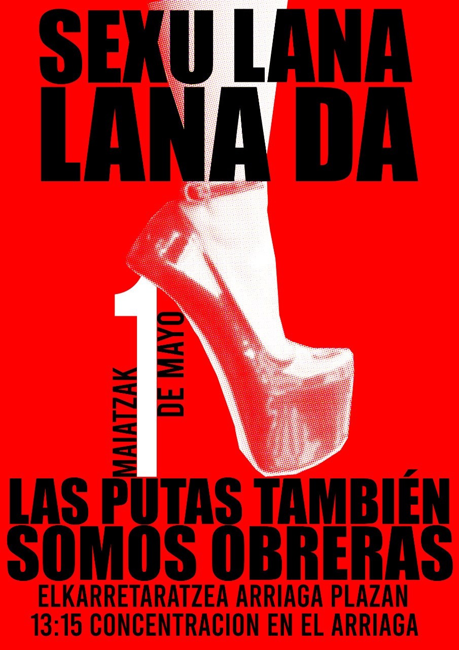 Gaur, maiatzak 1, langileon eguna, SEXU LANGILE ETA ALIATUOK sexu-langileak langileria garela aldarrikatzen dugu! Sexu-langileak borrokarako gaitasuna dugun pertsonak gara eta gaitasun politikoa dugun subjetuak; horregatik gure jarduera lana dela aldarrikatzen dugu. Maiatzaren lehena da eta gure jardueraren ESKUBIDEAK ETA ERREKONOZIMENDUA eskatzen dugu, sindikatuei eta kolektiboei entzun diezagutela eskatzen diegu, bere begirada moralista eta salbazionistarekin amaitzea eskatzen dugu EZ DUGU BEHAR INORK SALBA GAITZAN, ALIANTZAK ERAIKI BEHAR DITUGU. Sexu-lanaren jarduera ez aitortzeak lan hori kriminalizatzea dakar, oinarrizko gizarte- eta lan-eskubideak lortzea eragotziz. Estigma areagotzen du, eta horrek klandestinitatera eta prekarietatera garamatza. Sexu-lanaren abolizionismoa argudio moralistetan, higienistetan eta zigortzaileetan oinarritzen da. Begirada hori gorputzaren eta sexualitatearen kontzepzio sakralizatuetan oinarritzen da, sexu-lana egiten dugun pertsonen imajinario koloniala eta patriarkala elikatzen baitute. Gure borroka palanka boteretsua da, LANA BERE OSOTASUNEAN kuestionatzen duen tresna. Sexu-langileon errepresioa klase-dominazioan eta estrangeria-legean errotzen da, baita patriarkatuak berak ere elikatzen duen putekiko estigman. SEXU-LANA, LANA DA!