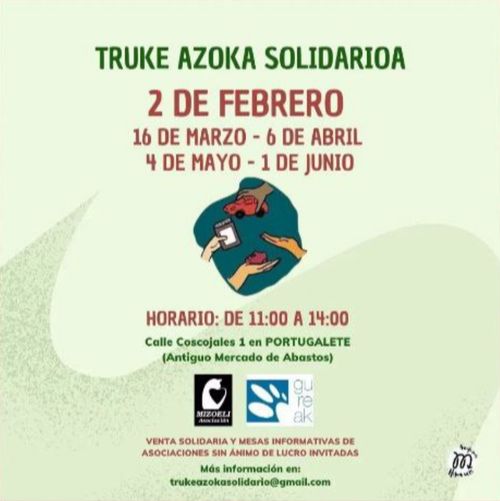 TRUKE AZOKA SOLIDARIOA Sunday, Apr 12, 2026, 11:00 AM-02:00 PM Sunday 12 April 14:00 Portuko Merkatua Coscojales kalea 1 - Portugalete azokaelkartasuna